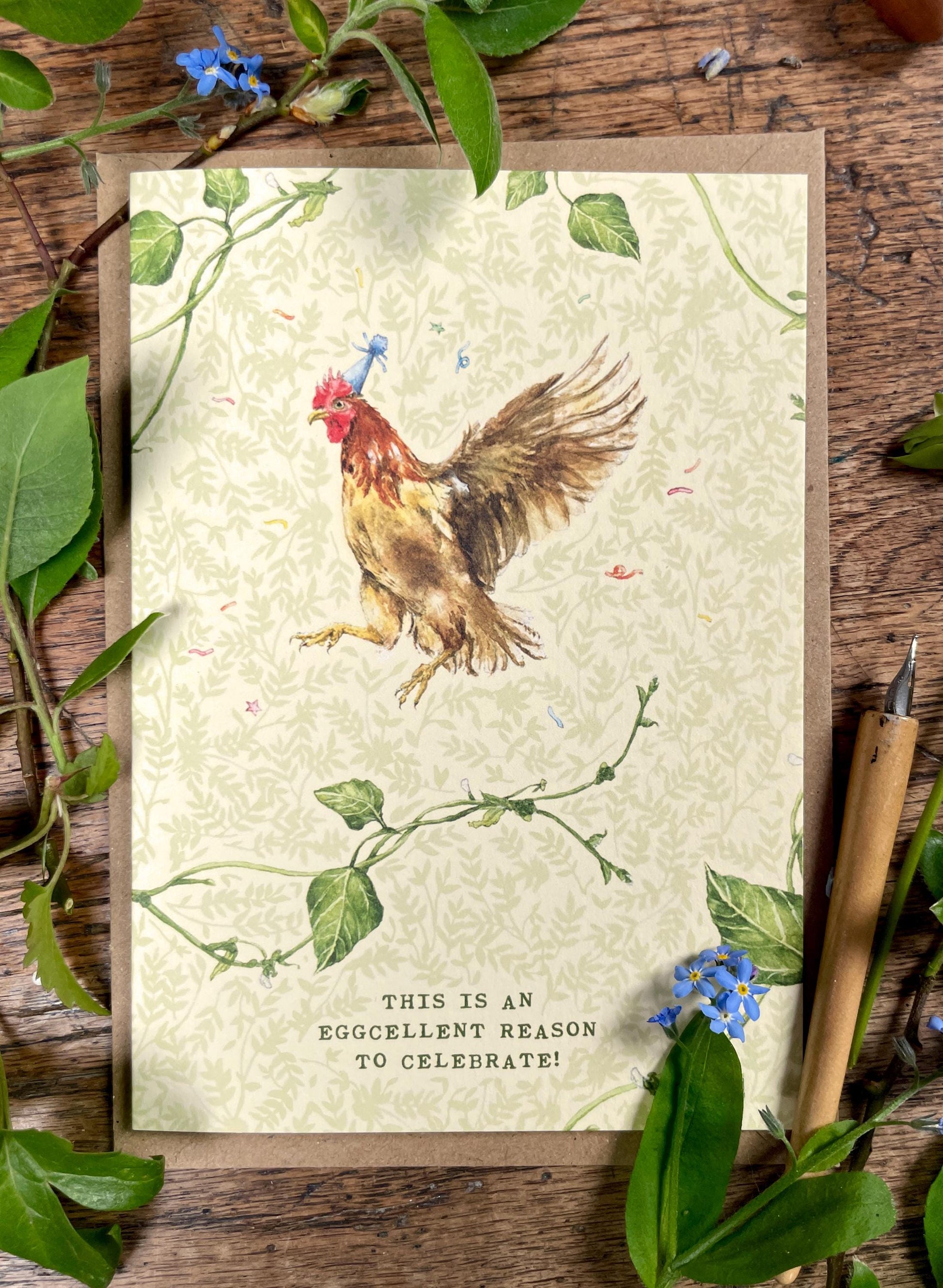 An Eggcellent reason to celebrate! Chicken Greetings Card | Whimsical Watercolour Art