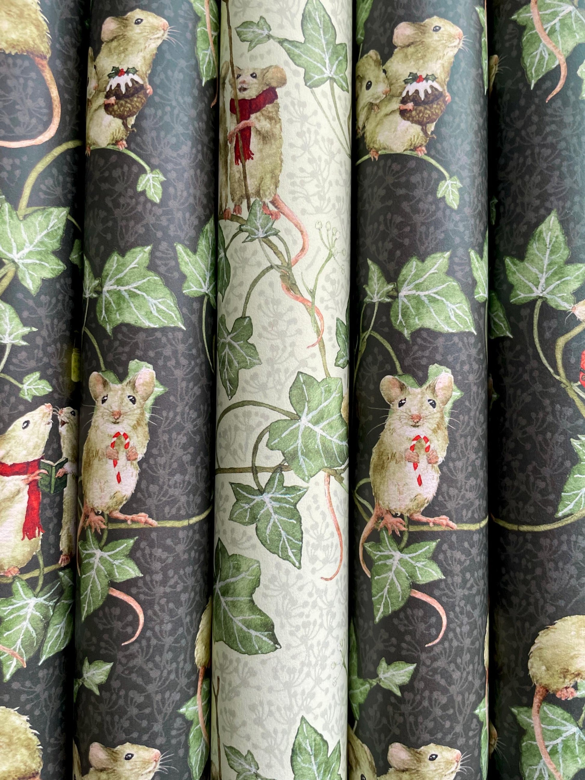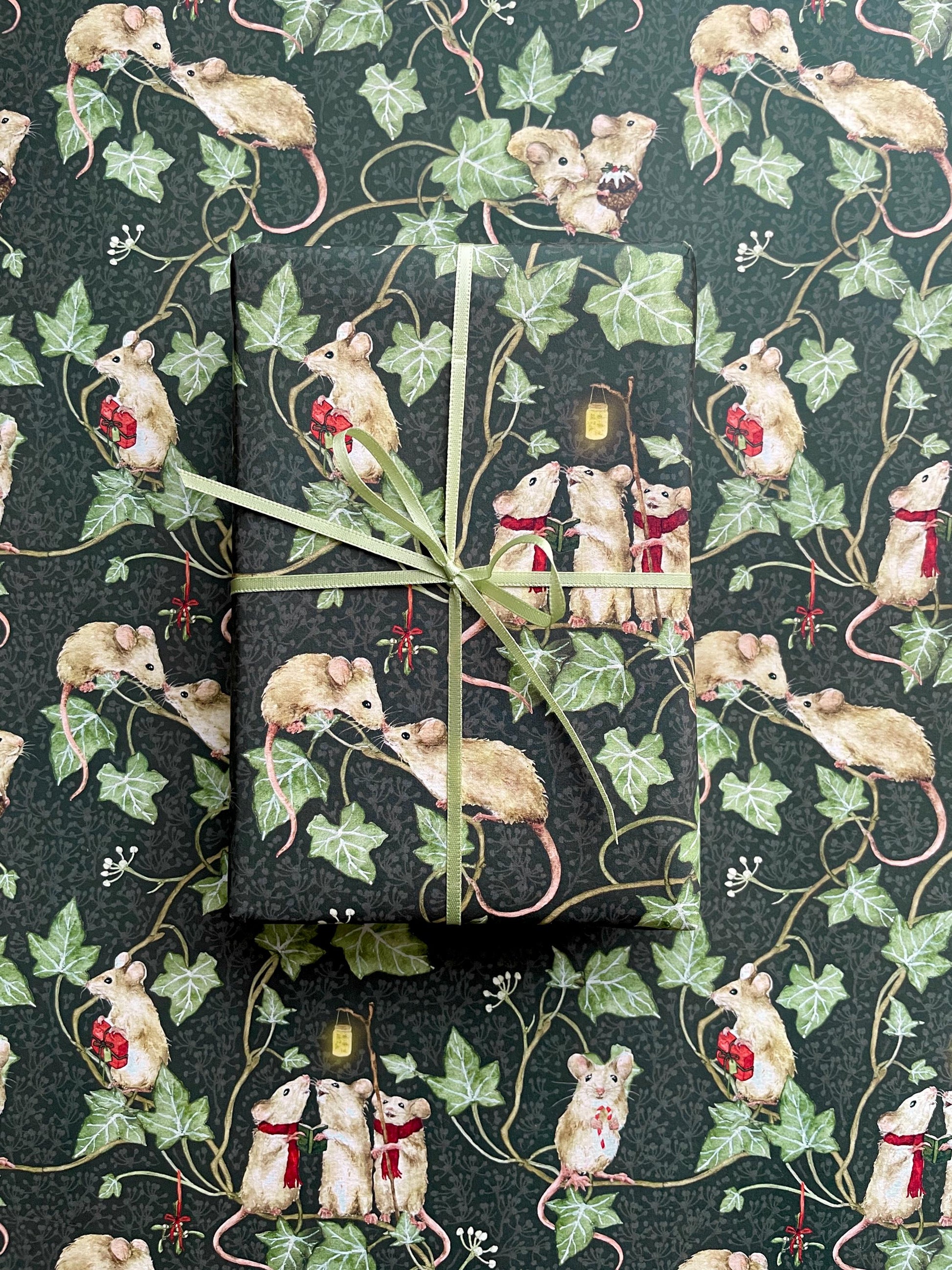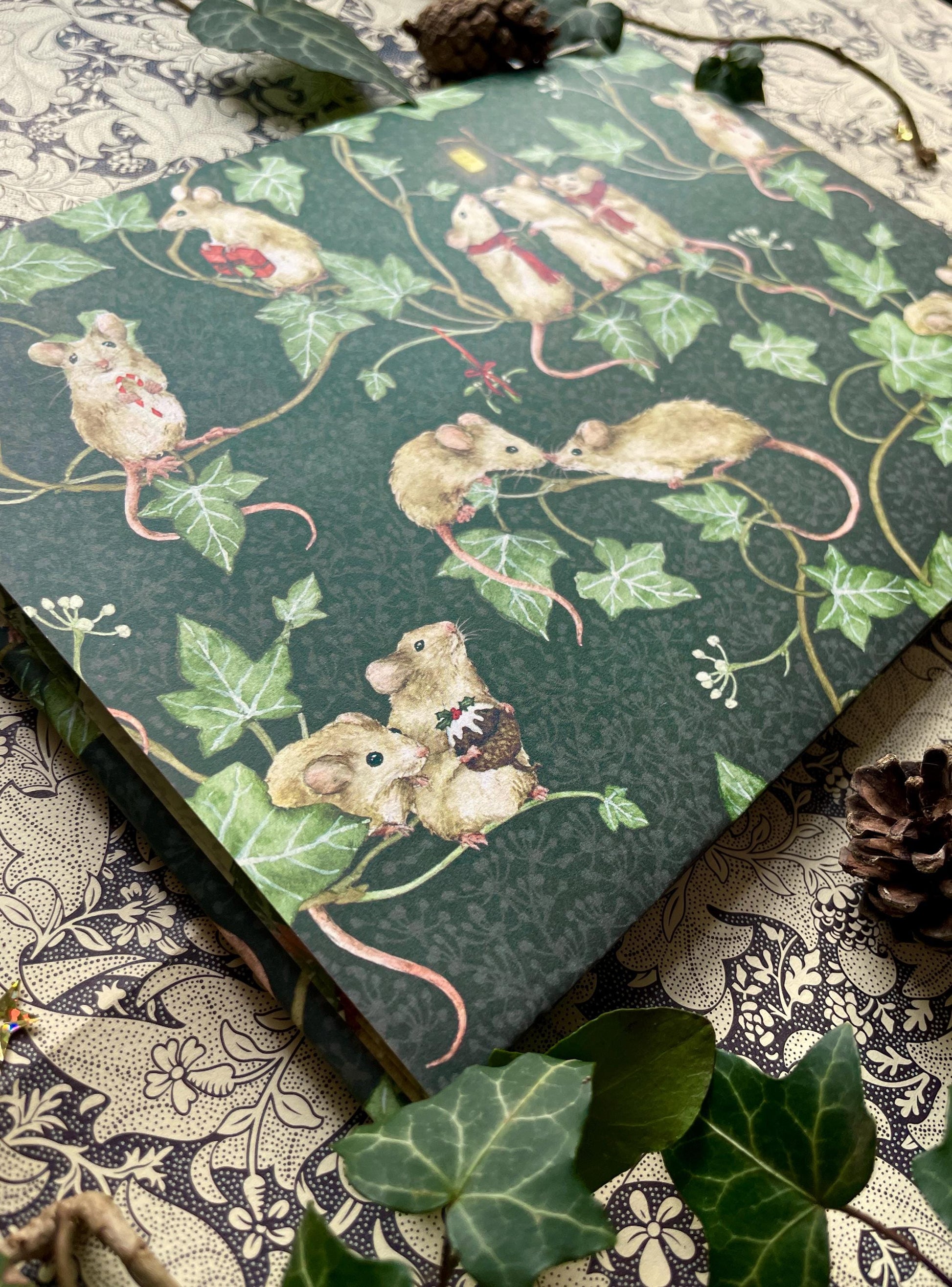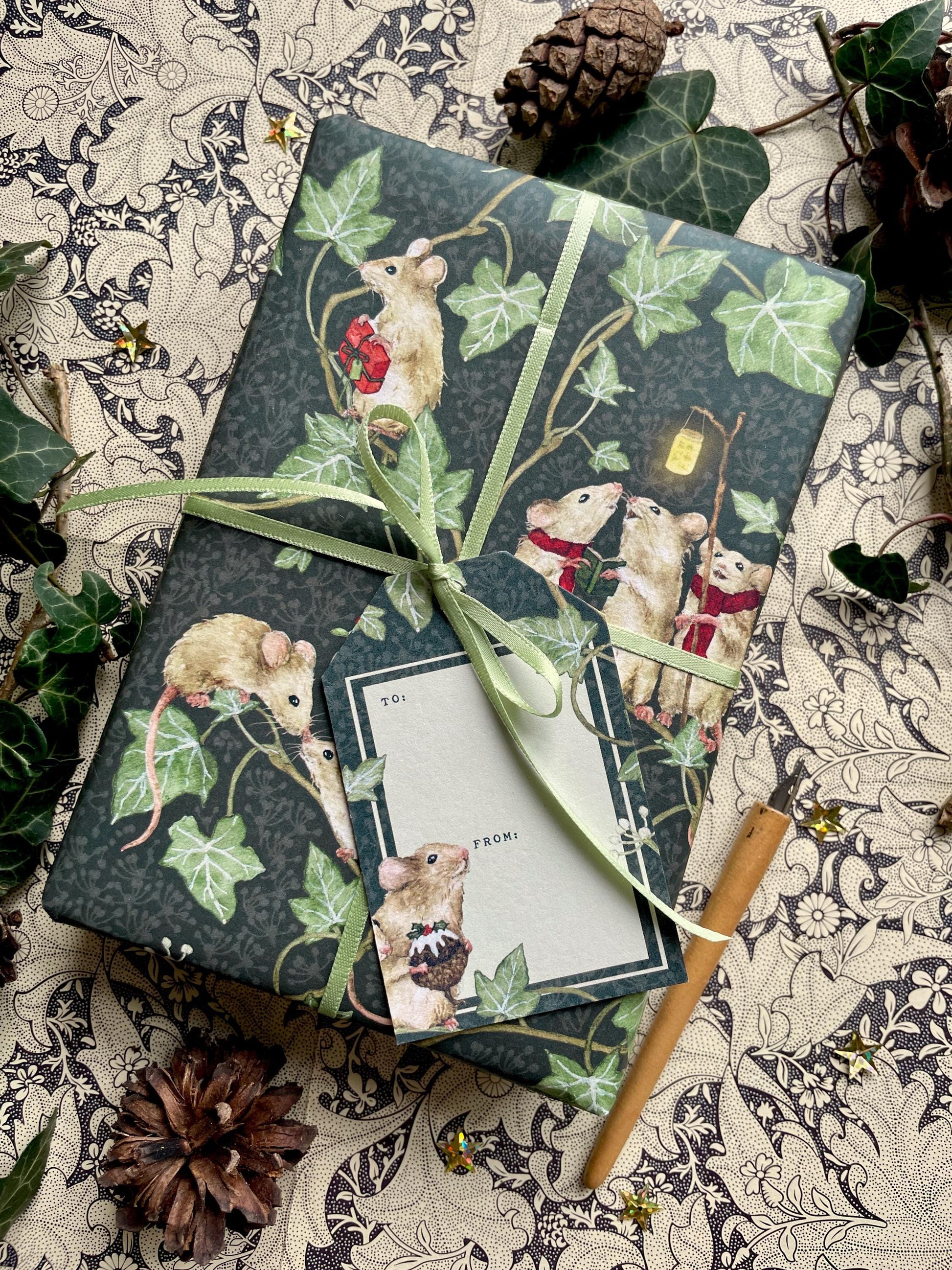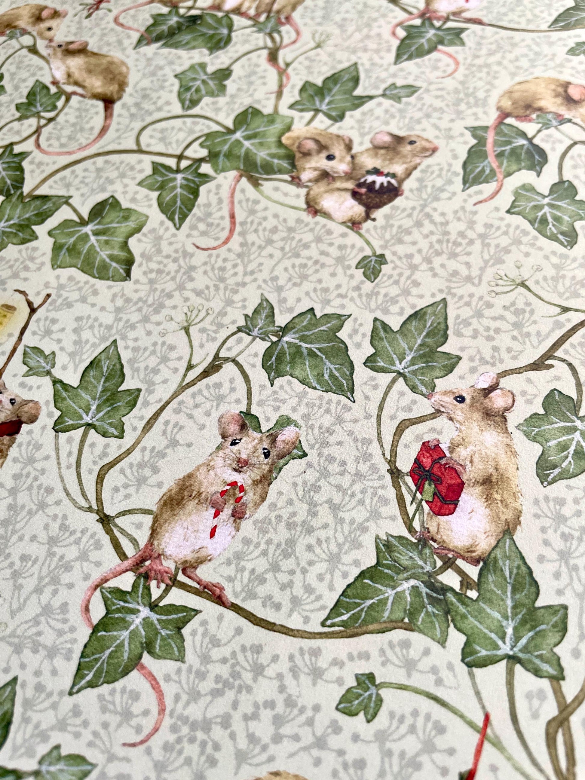 This wrapping paper features excited mice scampering through the ivy, gathering for all the traditional festive things we love, including carol singing, present giving, mistletoe kisses, Christmas pudding and candy canes.