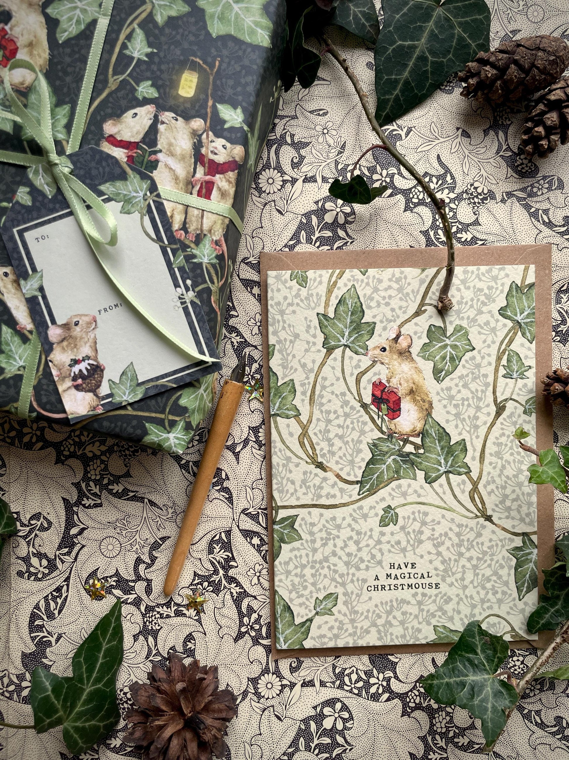 This greetings card features an excited mouse scampering through the ivy, gathering with friends for all the traditional festive things we love. This little mouse has a wrapped present to gift! A playful yet elegant design offers a perfect blend of whimsical fun and timeless style, making it a must-have for holiday greetings this season!