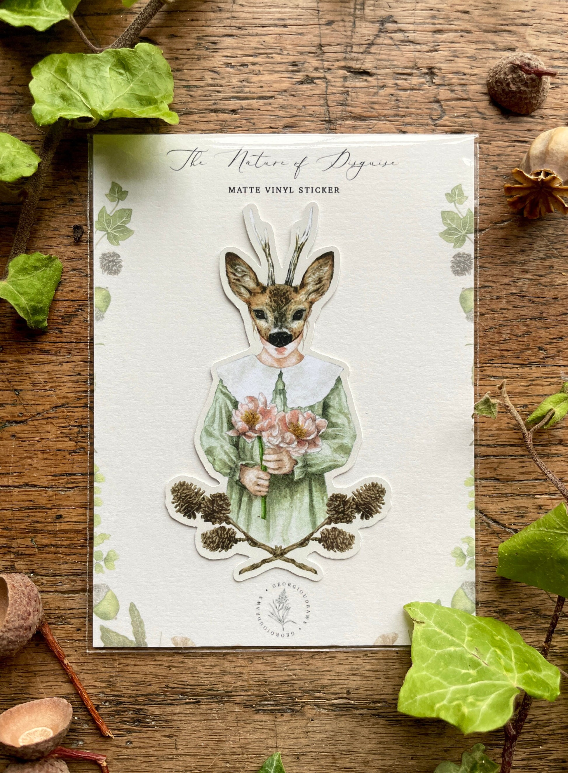 Girl in Deer Mask Matt Vinyl Sticker | Nature Woodland Illustration Art