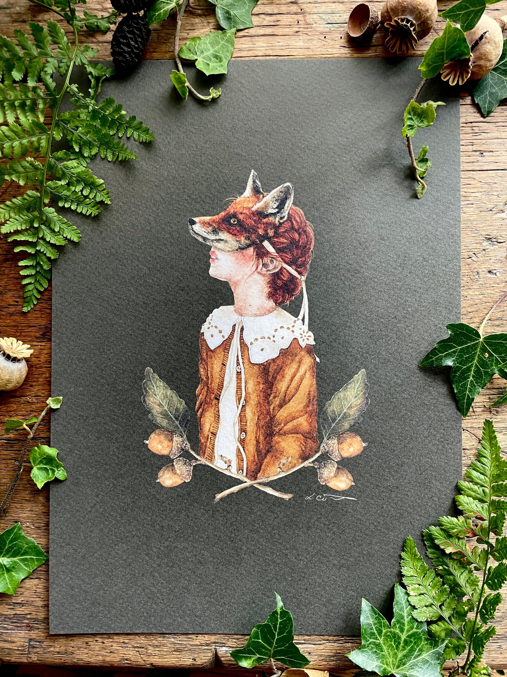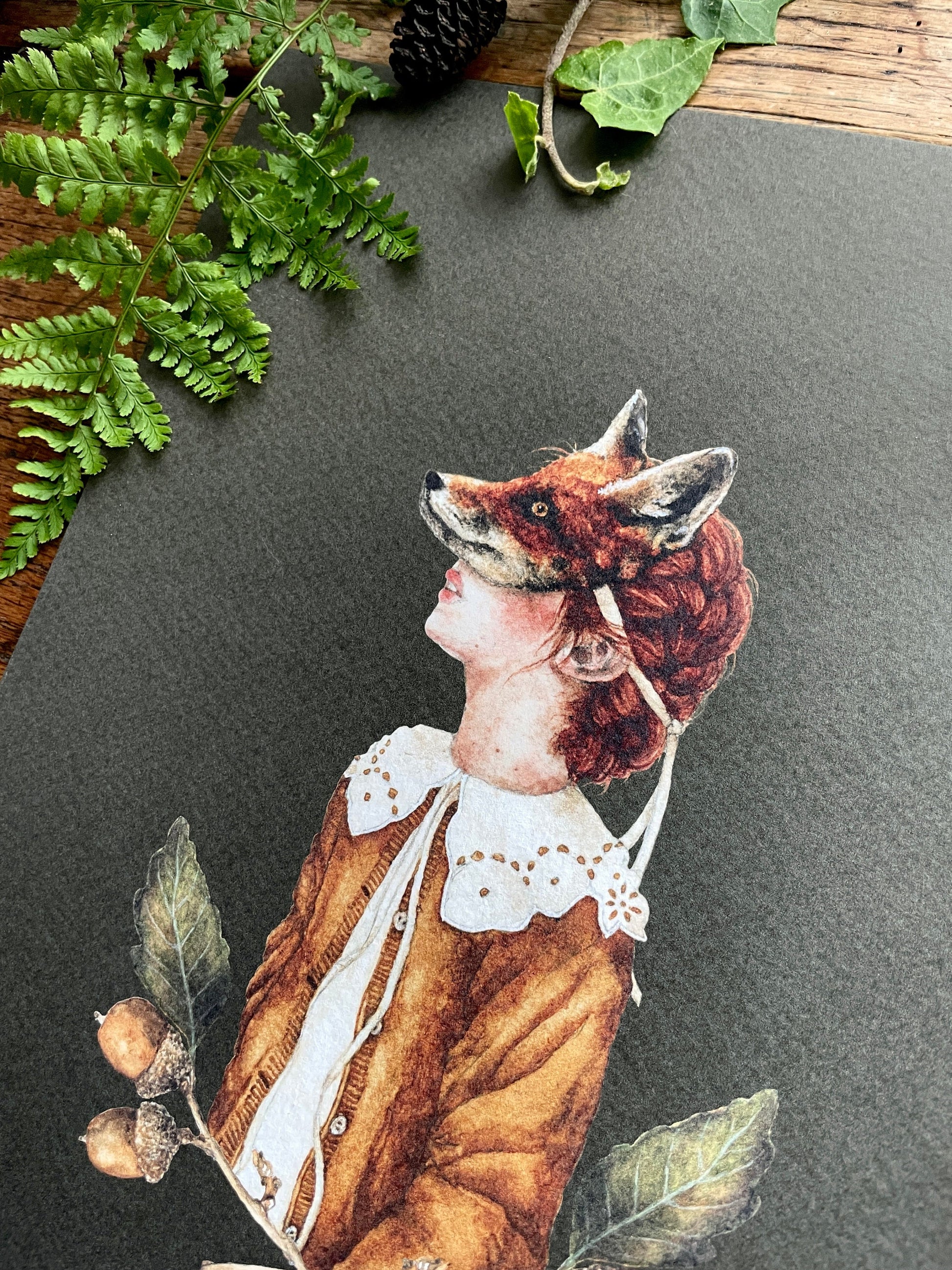Girl in Fox Mask With Acorns A4 Watercolour Art Print | Curious Woodland Art