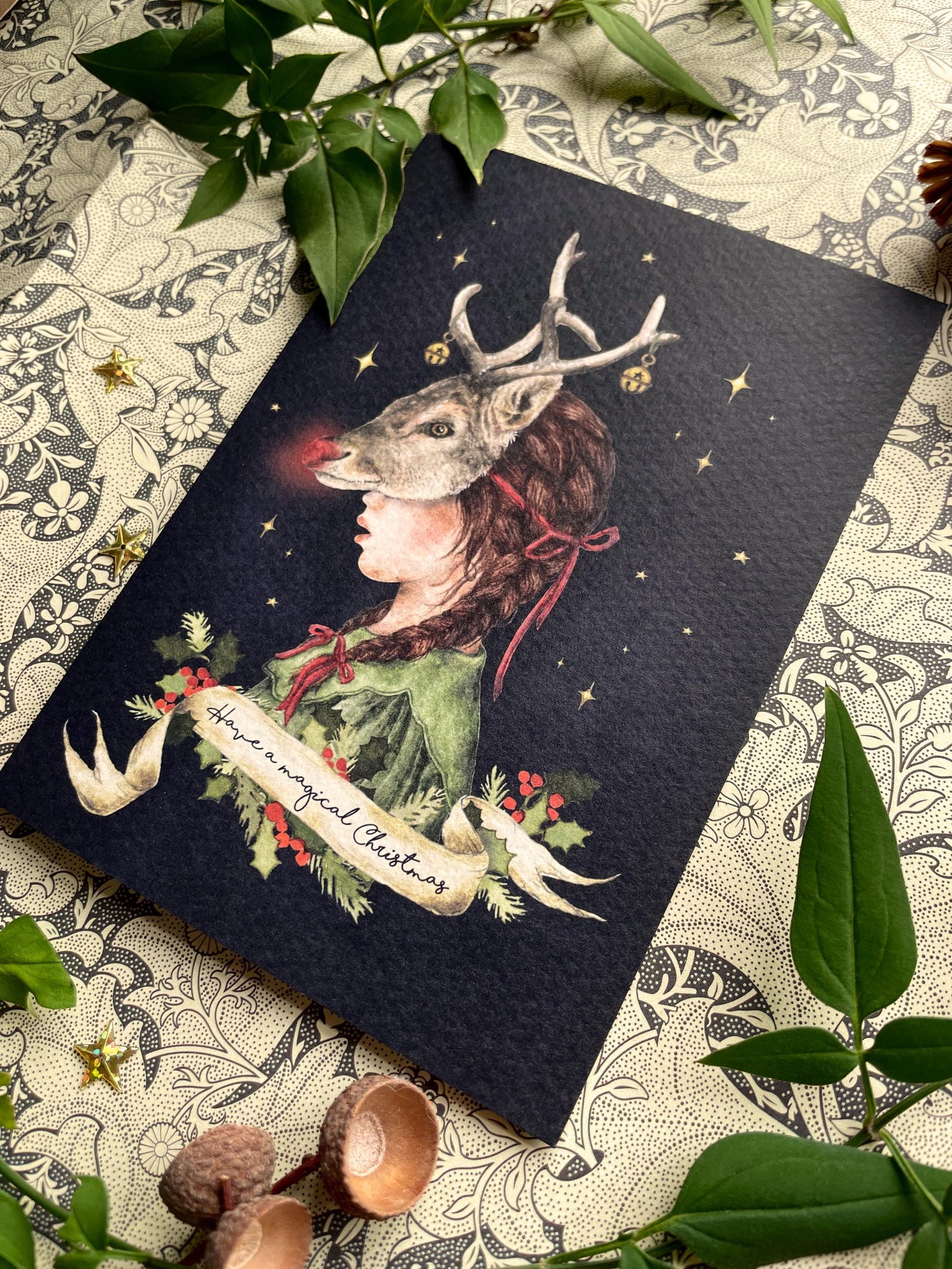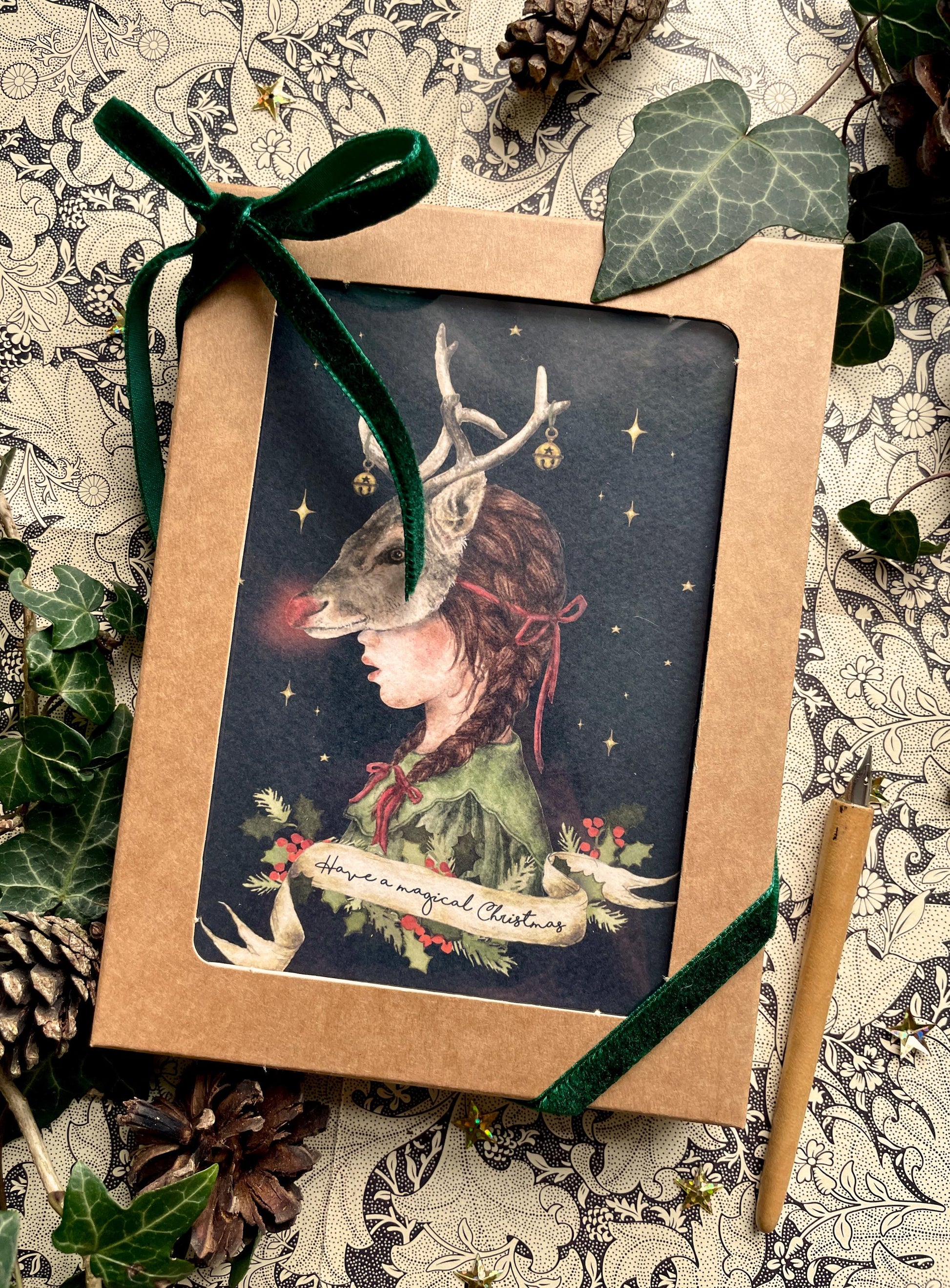 Send a little magic this Christmas with an enchanting greetings card! A little girl wearing a Rudolph mask and surrounded by stars captures the wonder of the season, and serves as a perfect reminder to celebrate the true spirit of Christmas. Happy Holidays!