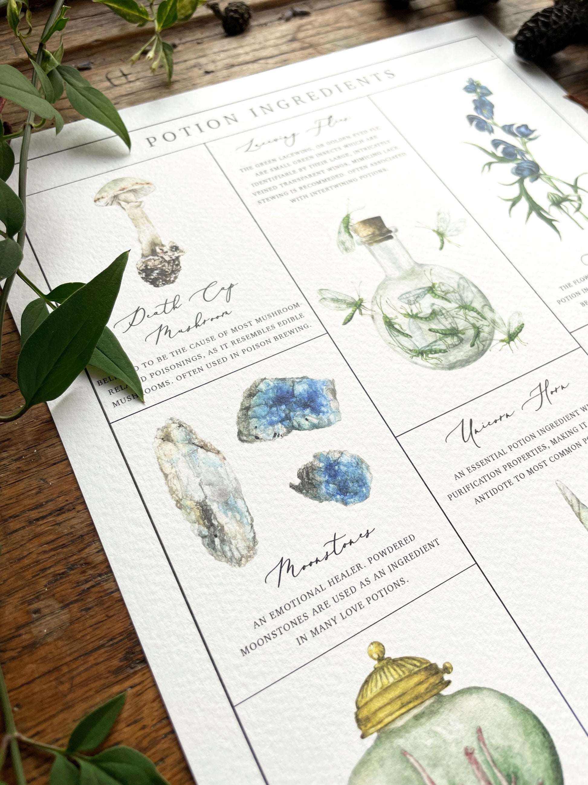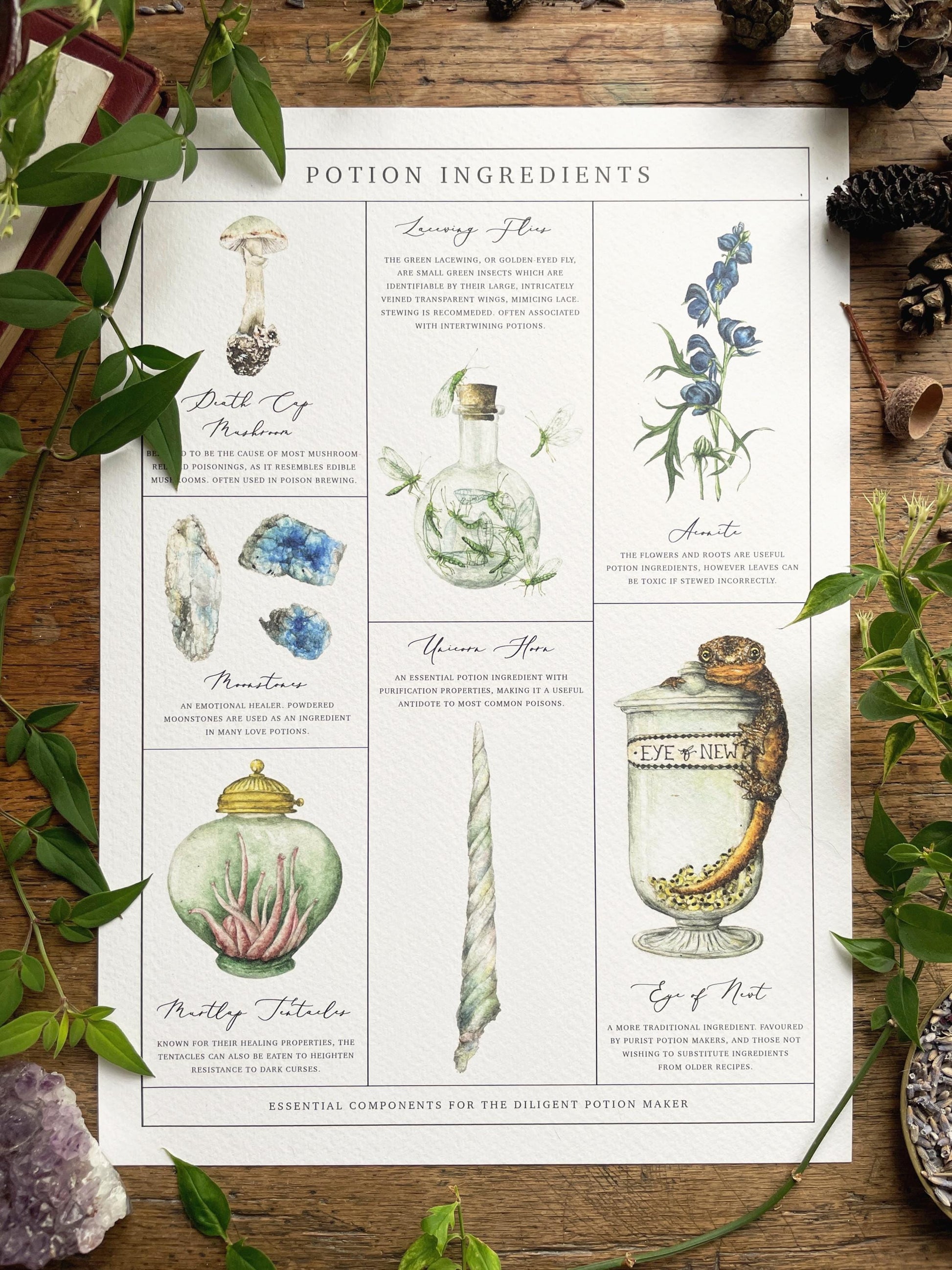 This chart features a collection of enchanting potion ingredients, just a few of the many specimens associated with the magical world of potion brewing. They include Death Cap Mushrooms, Lacewing Flies, Aconite, Murtlap Tentacles, Unicorn Horn and Eye of Newt. Illustrations are accompanied by descriptives, to assist the diligent potion maker with their choices.