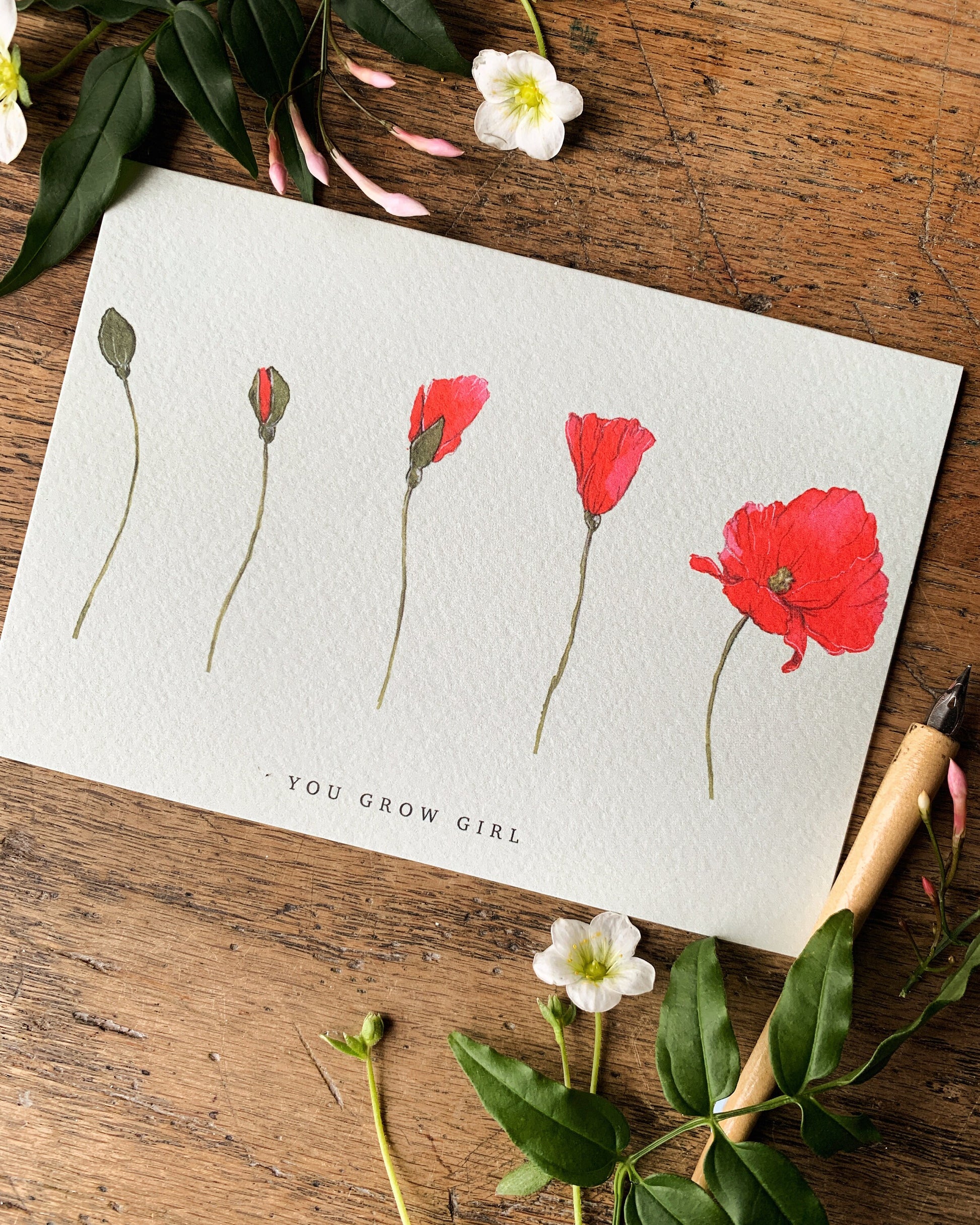 You Grow Girl Floral Poppy Watercolour Greetings Card